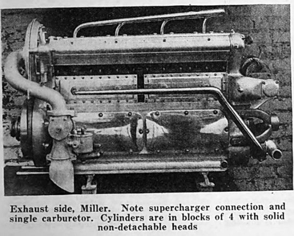 Exhaust side, Miller. Note supercharger connection and single carburetor. Cylinders are in blocks of 4 with solid non-detachable heads