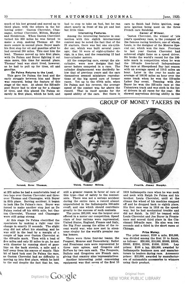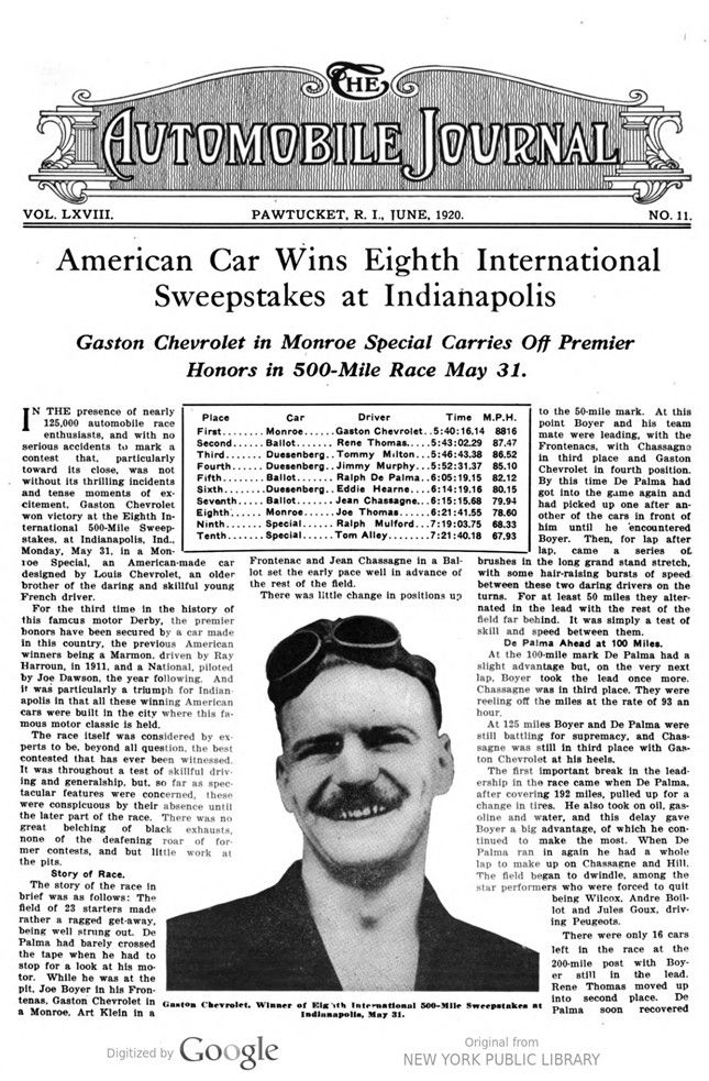 Gaston Chevrolet, the winner of this year’s speedway race, is the youngest of the famous racing brothers, one of whom, Louis, is the designer of the Monroe Special car, which won the race. Previous to last year Gaston Chevrolet had achieved slight fame as a speed driver. He broke the world’s record for the 100-mile mark in competition when he won the 100-mile free-for-all Independence Day race at Sheepshead Bay last season with an average speed of 110.5 miles an hour. Later in the year he made an average of 108.95 miles an hour over the same track when he won the 150-mile Labor Day event. Teaming with Joe Boyer he won the 225-mile race at the Uniontown track and was sixth in the list of drivers in all races for the year. He showed marvelous driving ability in the 1919 Indianapolis race when he was neck and neck with Ralph De Palma and his brother, Louis Chevrolet, until at the climax the wheel of his machine snapped off and he dropped back to eighth place. His first race was in 1916 on the speedway, but he had mechanical trouble and did not finish. In 1917 he teamed with Louis Chevrolet and Joe Boyer in Frontenacs and scored third place in the Cincinnati 300-mile race. He also won two seconds and a third in the short races at Chicago.