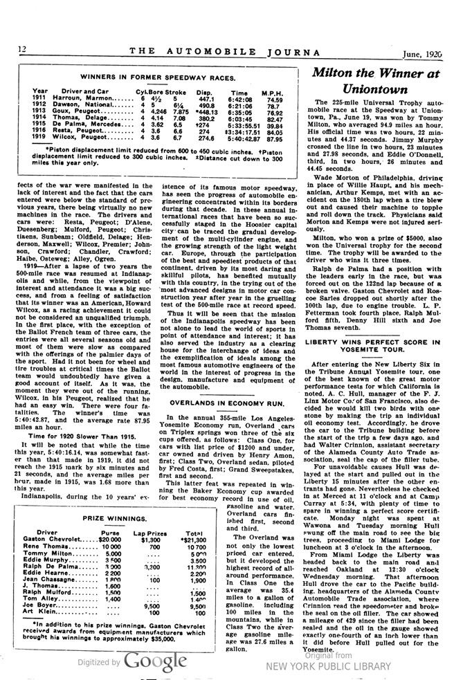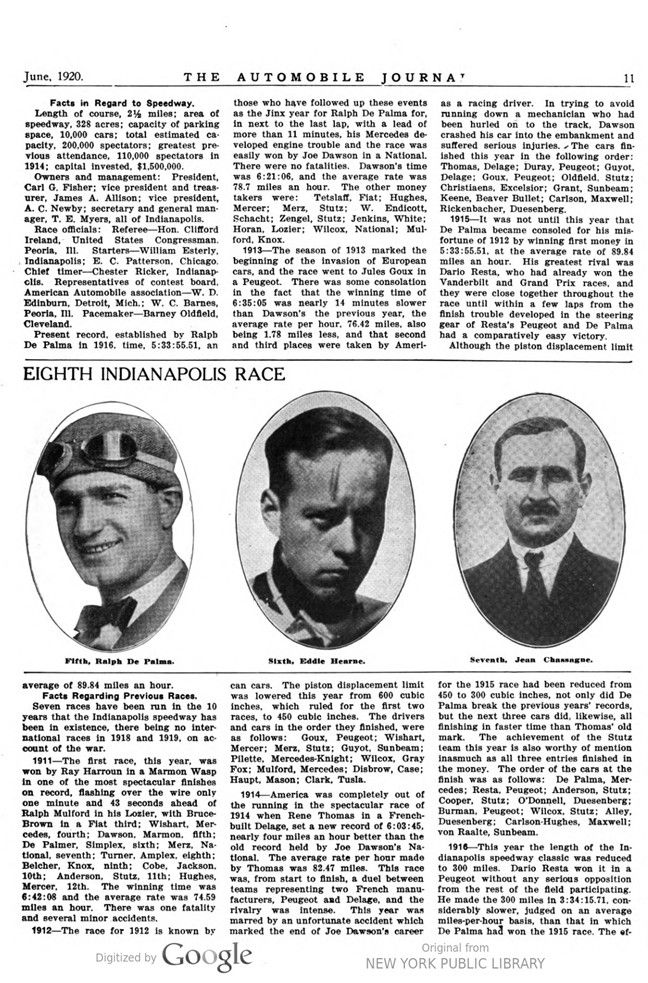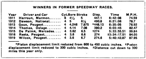 It will be noted that while the time this year, 5:40:16.14, was somewhat faster than that made in 1919, it did not reach the 1915 mark by six minutes and 21 seconds, and the average miles per hour, made in 1915, was 1.68 more than this year.