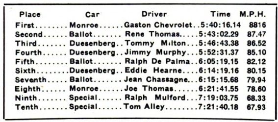 Present record, established by Ralph De Palma in 1916, time, 5:33:55.51, an average of 89.84 miles an hour.