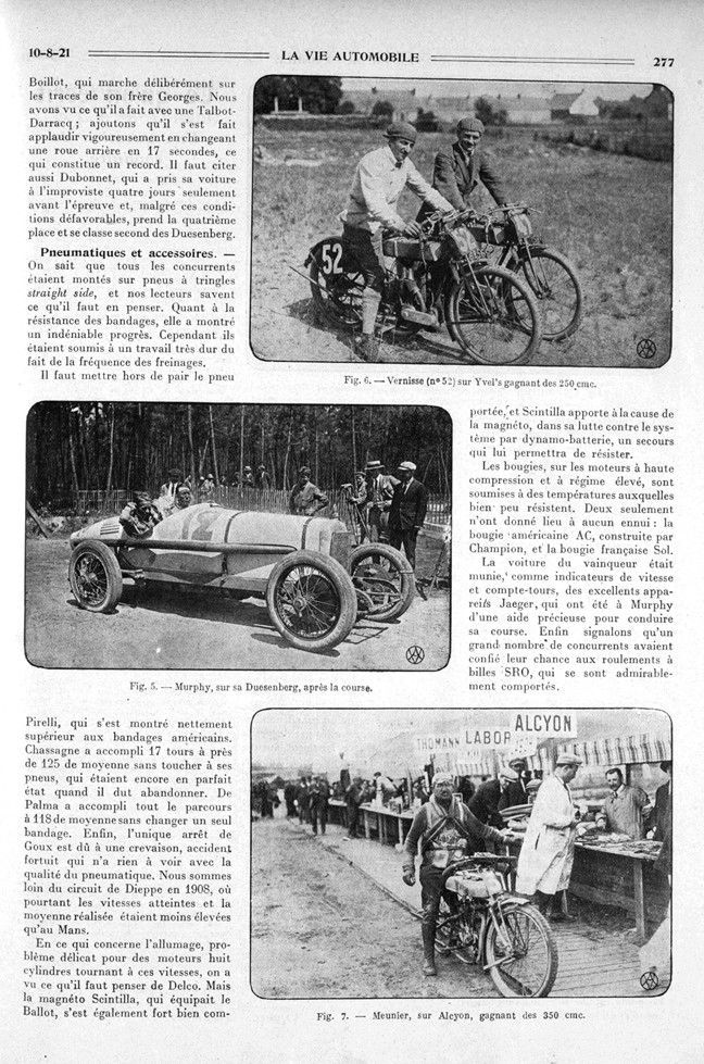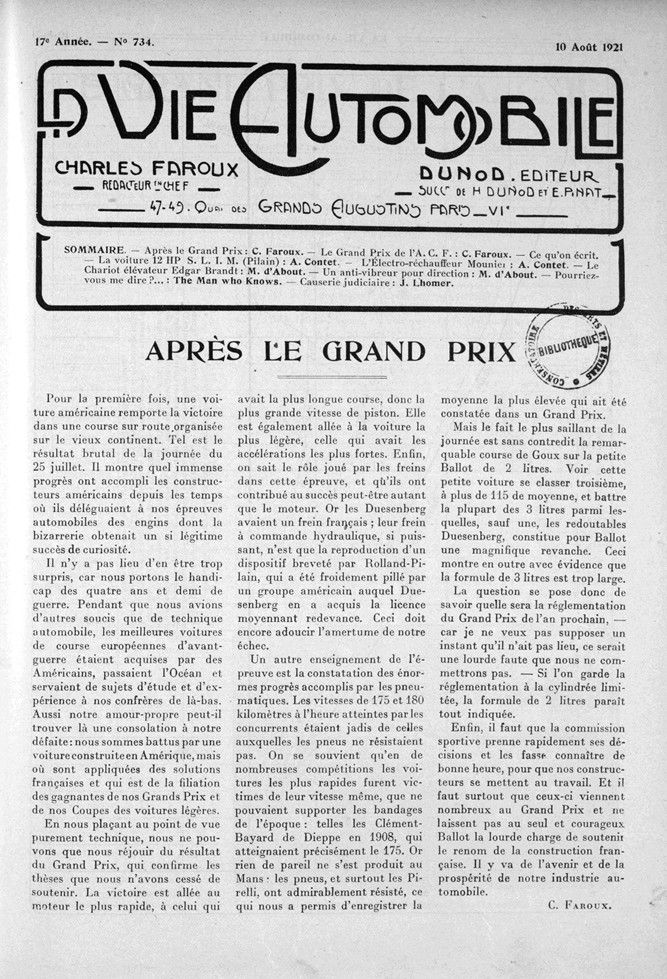 From a purely technical point of view, we can only rejoice at the result of the Grand Prix, which confirms the theories we have always supported. Victory went to the fastest engine, the one with the longest stroke and therefore the highest piston speed. It also went to the lightest car, the one with the strongest acceleration. Finally, we know the role played by brakes in this event, and that they contributed to the success perhaps as much as the engine. However, the Duesenbergs had French brakes; their powerful hydraulic brakes are simply a reproduction of a device patented by Rolland-Pilain, which was coldly plundered by an American group from which Duesenberg acquired the license for a fee. This should further soften the bitterness of our failure.