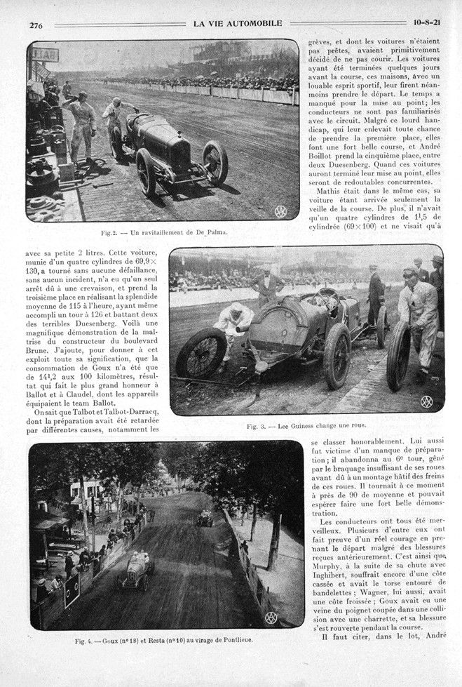 We know that Talbot and Talbot-Darracq, whose preparations had been delayed for various reasons, notably strikes, and whose cars were not ready, had originally decided not to race. However, as the cars were completed a few days before the race, these manufacturers, in a commendable spirit of sportsmanship, allowed them to take part. There was not enough time for fine-tuning, and and the drivers were unfamiliar with the circuit. Despite this serious handicap, which ruled out any chance of taking first place, they had a very good race, with André Boillot finishing fifth, between two Duesenbergs. Once these cars had been fine-tuned, they would be formidable competitors.