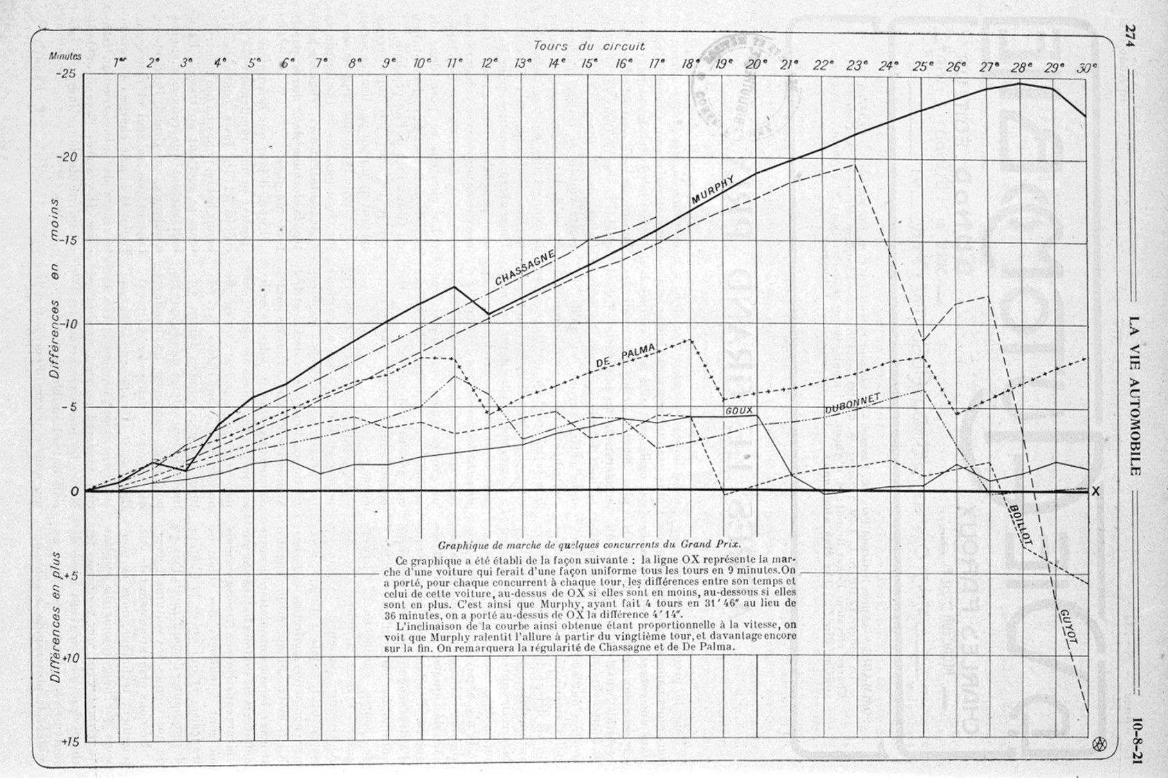 Again, Charles Faroux has written reports in La Vie Automobile, on the 1921 French Grand Prix at la Sarthe road course. This last one is something like an after-the-race analysis, in which a graphical representation shows the time difference between several drivers during each race lap. Translated by deepL.com.