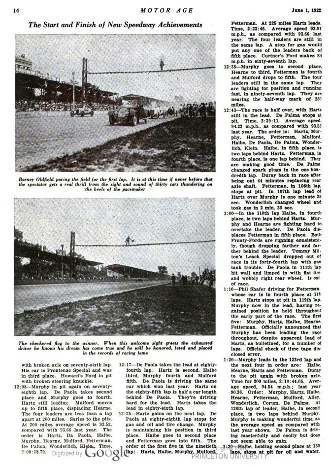 12:43 – The race is half over, with Hartz still in the lead. De Palma stops at pit. Time, 2:39:11. Average speed, 94.23 m.p.h., as compared with 93.53 last year. The order is: Hartz, Murphy, Hearne, Fetterman, Mulford, Haibe, De Paola, De Palma, Wonder- lich, Klein. Haibe, in fifth place, is two laps behind Hartz. Fetterman, in fourth place, is one lap behind. They are making good time. De Palma changed spark plugs in the one hundredth lap. Duray back in race after being out 44 minutes replacing rear axle shaft. Fetterman, in 106th lap, stops at pit. In 107th lap lead of Hartz over Murphy is one minute 25 sec. Wonderlich changed wheel and took gas in 2 min. 30 sec.