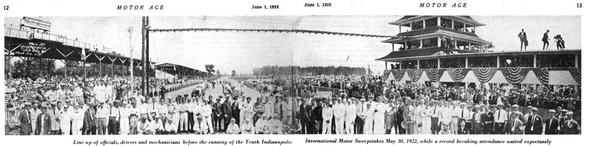 Line up of officials, drivers and mechanicians before the running of the Tenth Indianapolis International Motor Sweepstakes May 30, 1922, while a record-breaking attendance waited expectantly