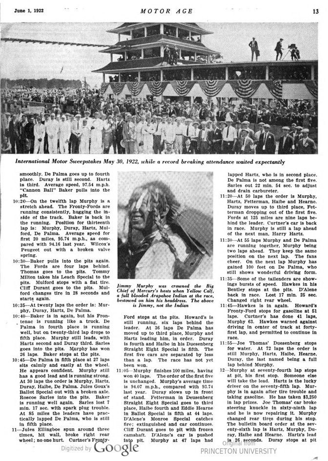 10:10 – Murphy wins fourth lap. Duray second, De Palma third. Murphy has almost lapped the Ford. Murphy wins the fifth lap, having lapped the Fords. For the first four laps, 97.34 m.p.h. is Murphy’s average speed. He wins the sixth lap.