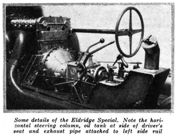 Some details of the Eldridge Special. Note the horizontal steering column, oil tank at side of driver’s seat and exhaust pipe attached to left side rail