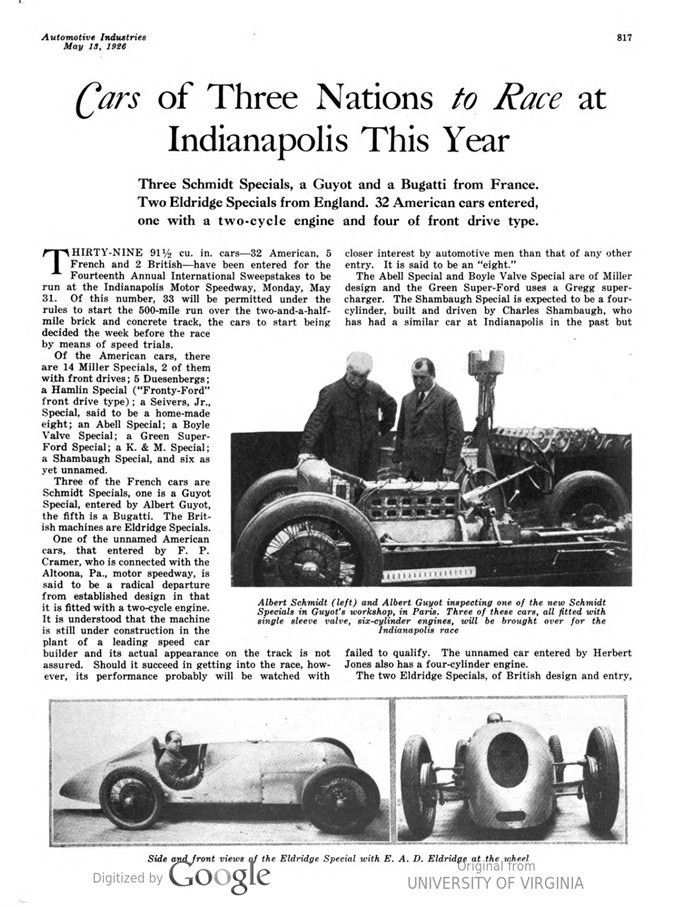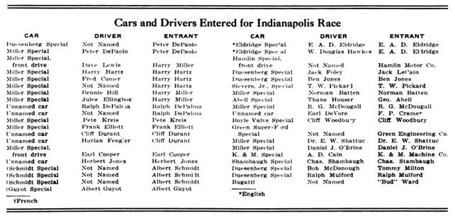 Three Schmidt Specials, a Guyot and a Bugatti from France. Two Eldridge Specials from England. 32 American cars entered, one with a two-cycle engine and four of front drive type.