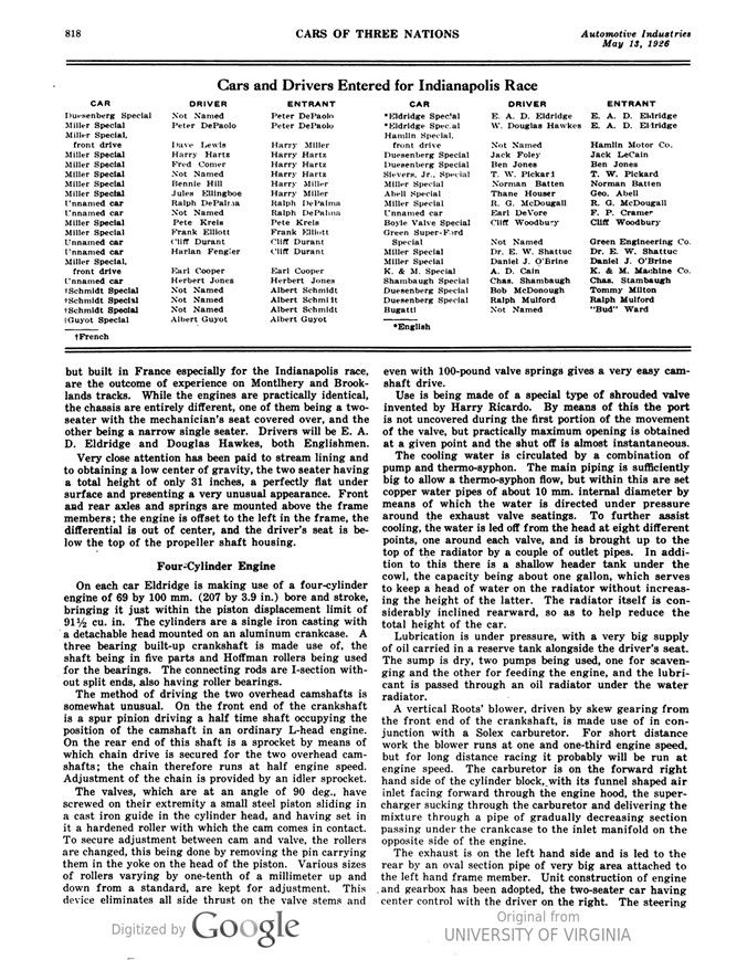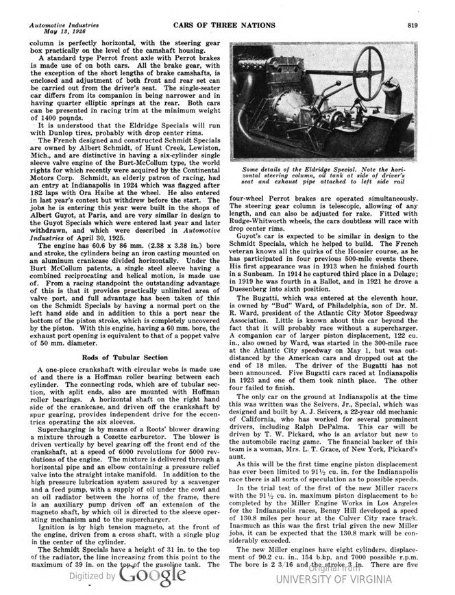 An interesting technical desciption and at the same time a short survey on some of the 1926 European and American cars, that were to compete in the 1926 Indianapolis 500 race. The American Miller cars, the Duesenberg’s, even a first two-cycle engined car as well as the front-wheel driven Hamlin Special. From the European side, the Eldridge- and Schmidt Specials, as well as the Guyot and Bugatti cars are shortly discussed.