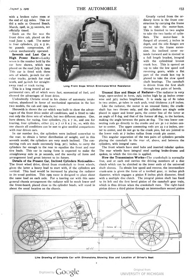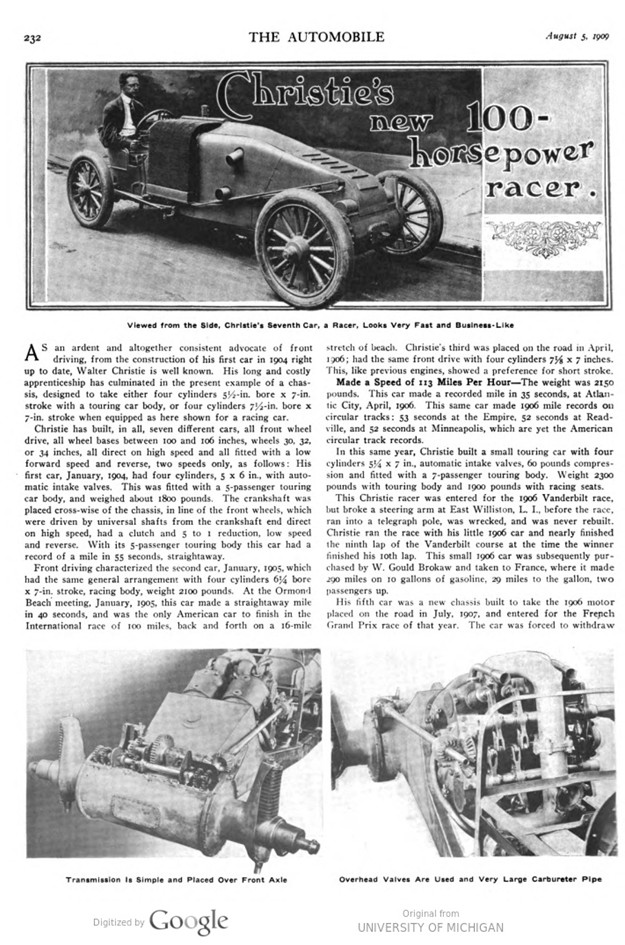 This article explains the latest 1909 Christie designed racer. It should encompass all experience, gained with the previous models. This writing is so meticulous, that it gives me the impression, Walter Christie himself has written this.