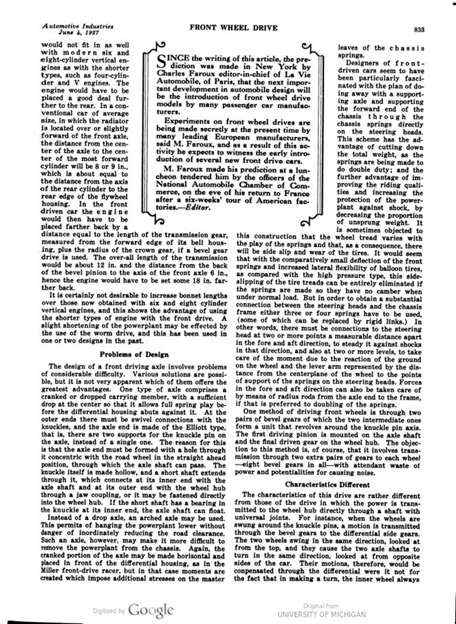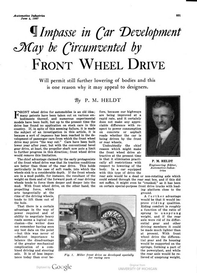 Over many years, the technical specialist and highly rated author Peter Martin Heldt wrote for several American automotive magazines. In this 1927 article in Automotive Industries, he explains the different aspects of the then upcoming front-wheel drive. Because of its lengthy write, it’s divided here in two parts. Not only an interesting read, but I find it baffling how in-depth he decsribes the many different aspects of front-wheel drive.