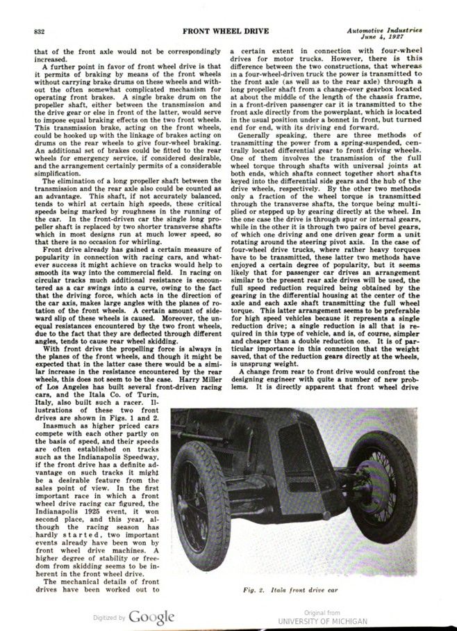 With front drive the propelling force is always in the planes of the front wheels, and though it might be expected that in the latter case there would be a similar increase in the resistance encountered by the rear wheels, this does not seem to be the case. Harry Miller of Los Angeles has built several front-driven racing cars, and the Itala Co. of Turin, Italy, also built such a racer. Illustrations of these two front drives are shown in Figs. 1 and 2.