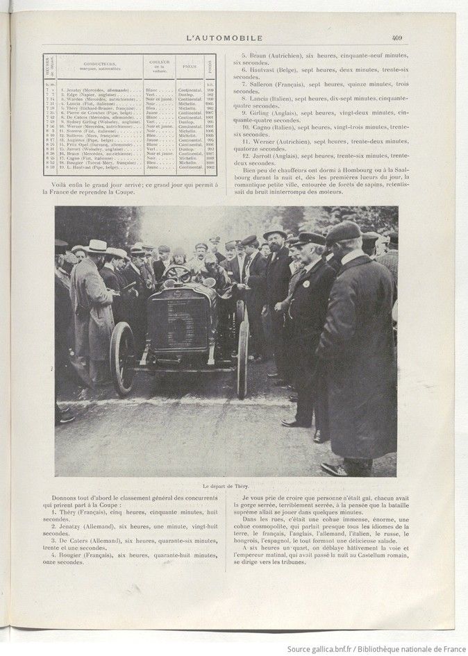 And we can be proud of this victory, which we won at the cost of many sacrifices and, alas, often many tears; but what is the point of dwelling on cruel losses? Today, we have the right, the duty, to be filled with joy and to express it with all our might.    In the opinion of most of our great builders, and of those involved in mechanical locomotion, and even in the opinion of the race participants, we were heading toward an almost certain defeat, and we return victorious, victorious across the board, since not only did our compatriot Thery take the top spot, but also because Rougier and Salleron, too, finished the race, giving France first place in the team standings and thus defeating the other nations, none of whose representatives were able to go the distance.