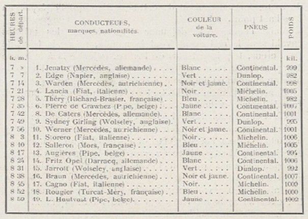 The weather had cleared up, the roads were dry, preparations were complete; all that remained was to wait for sunrise to give the start. It was given, at the following times, to the following eighteen cars: (see the table here left).