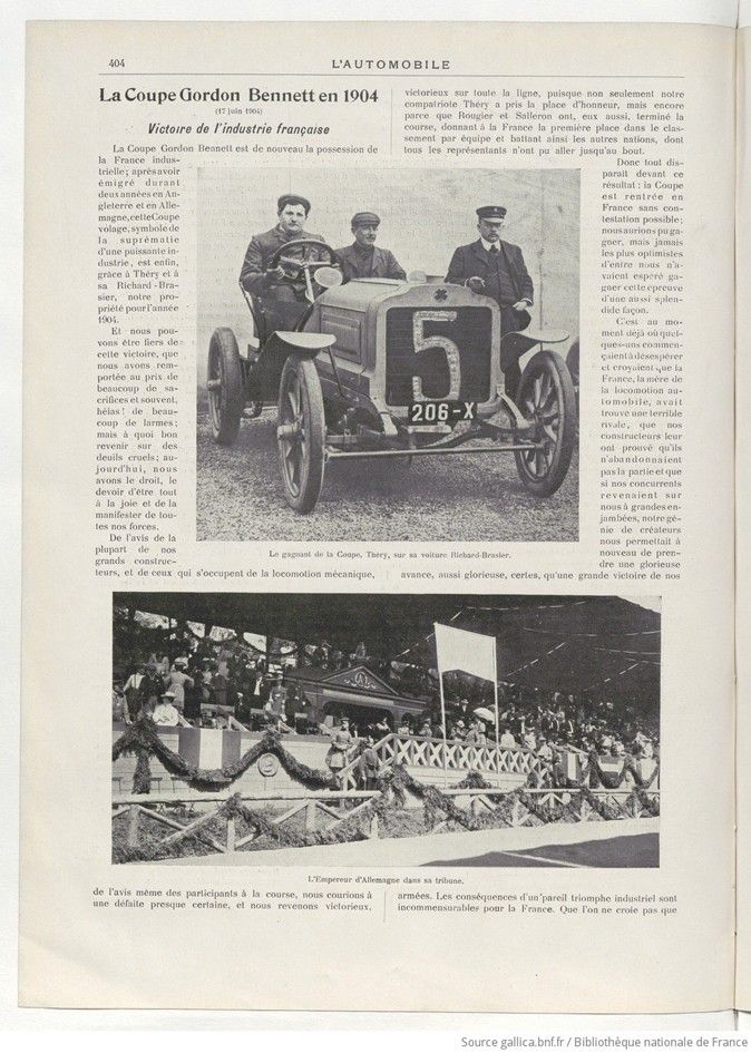 The Gordon Bennett Cup is once again in the hands of industrial France; after spending two years in England and Germany, this elusive Cup, a symbol of the supremacy of a powerful industry, is finally, thanks to Théry and his Richard-Brasier, ours for the year 1904.