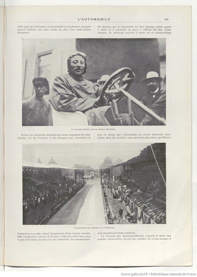 Page 405. The runner-up, Jenatzy, in his Mercedes car. – General view of the grandstands at Saalbourg.