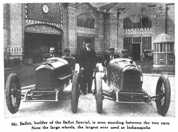 Page 14. Mr. Ballot, builder of the Ballot Special, is seen standing between the two cars. Note the large wheels, the largest ever used at Indianapolis. – The eight-cylinder Ballot engine has two carbureters and one magneto. There are two overhead camshafts, gear driven.