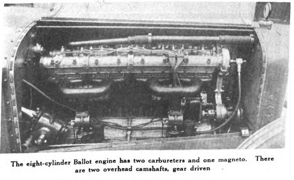When the Ballot company undertook the construction of these machines it was guided by the experience of René Thomas, who decided that Indianapolis called for a very low center of gravity, good balance and suspension to reduce tire wear, and exceptionally rapid pick-up. The wheel diameters are the biggest ever used on Indianapolis track and the cars are the lowest ever seen in America. The final gear ratio has been laid out with the nature of the track in view.