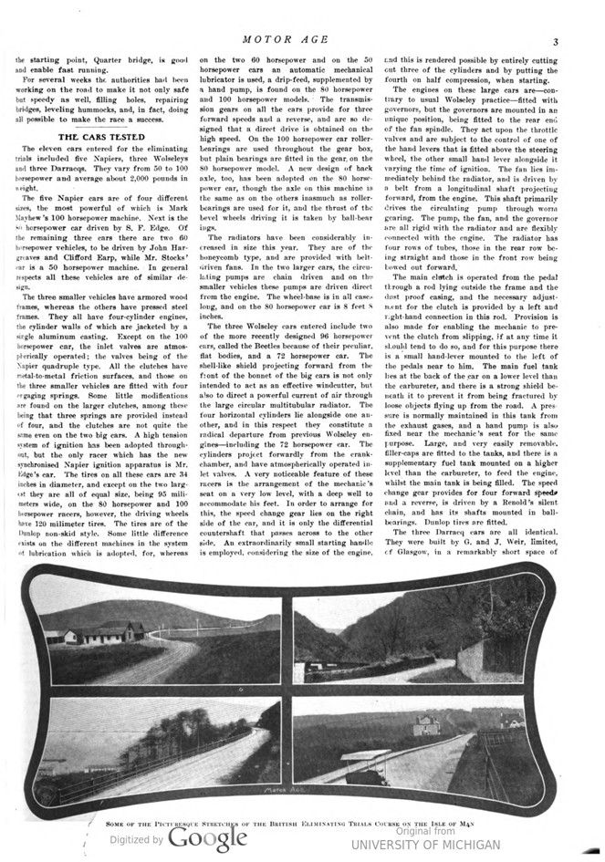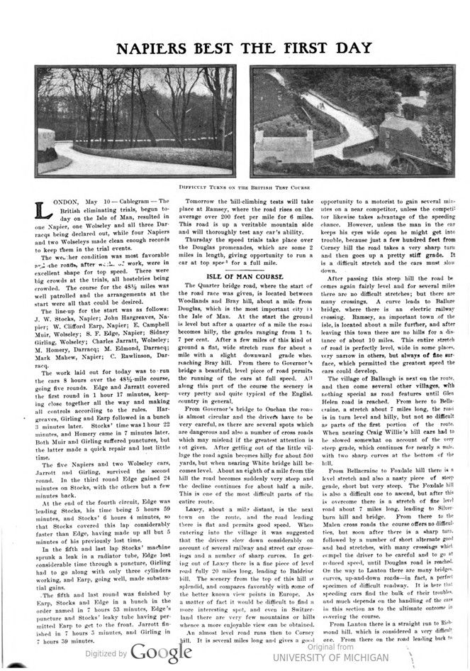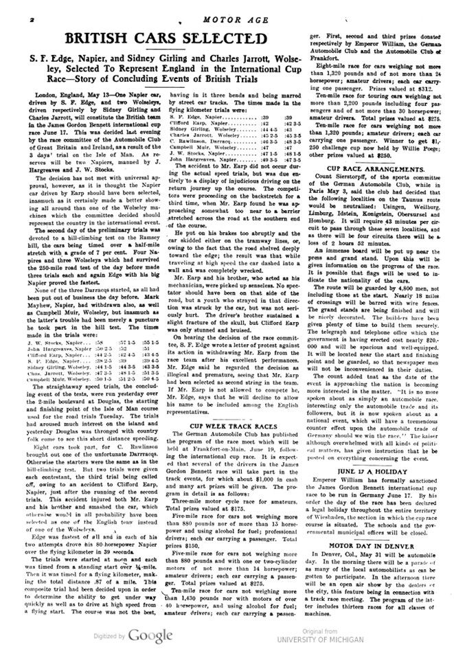 In these May 12 and May 19 issues of Motor Age“ , the English Elimination Trials are covered. A description of the course itself and of the eleven cars that entered the trials; the Napiers, Wolseleys and the Darracqs. Finally Selwyn Francis Edge in a Napier; Sidney Girling and Charles Jarrott each in a Wolseley were selected for the Cup race.