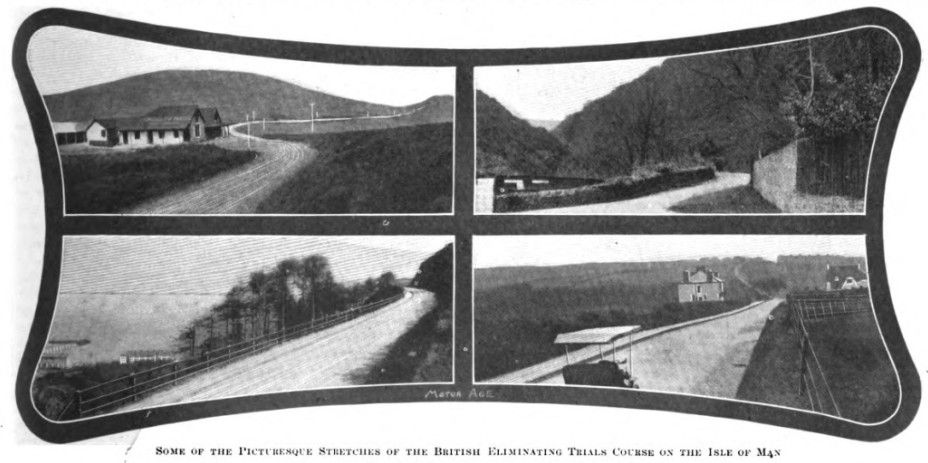 From Bellacraine to Foxdale hill there is a level stretch and also a nasty piece of steep grade, short but very steep. The Foxdale hill is also a difficult one to ascend, but after this is overcome there is a stretch of fine level road about 7 miles long, leading to Silverburn hill and bridge. From there to the Malen cross roads the course offers no difficulties, but soon after there is a sharp turn. followed by a number of short alternate good and bad stretches, with many crossings which compel the driver to be careful and to go at reduced speed, until Douglas road is reached. On the way to Lanton there are many bridges. curves, up-and-down roads – in fact, a perfect specimen of difficult roadway. It is here that speeding cars find the bulk of their troubles. and much depends on the handling of the cars in this section as to the ultimate outcome in covering the course.