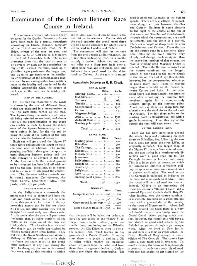 Measurements of the Irish course finally selected for the Gordon Bennett Road race have been made by a special committee consisting of Claude Johnson, secretary of the British Automobile Club; S. F. Edge, winner of the race last year, and Messrs. W. G. D. Goff and R. J. Mecredy, of the Irish Automobile Club. The measurements show that the total distance to be covered by each car in completing the „figure 8“ is about 102 miles, made up of 56 miles 1,540 yards over the larger loop and 45 miles 440 yards over the smaller. By consultation of the accompanying map, redrawn by our cartographer from military maps of the locality and data issued by the British Automobile Club, the course of each car in the race can be readily followed.