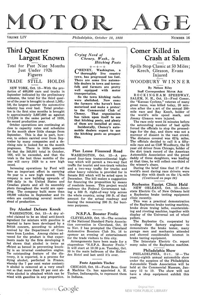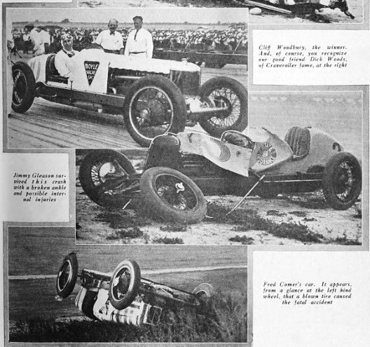 A peculiar thing about it was that Comer was driving the car which was entered by Cliff Woodbury, the winner, having swapped seats with him just a few minutes before the start of the race. While Comer lay beneath Woodbury’s machine, Woodbury was fighting to hold a slim lead, being pressed very hard by Ralph Hepburn, the Bostonian.