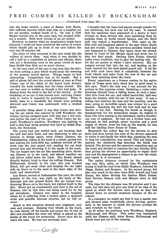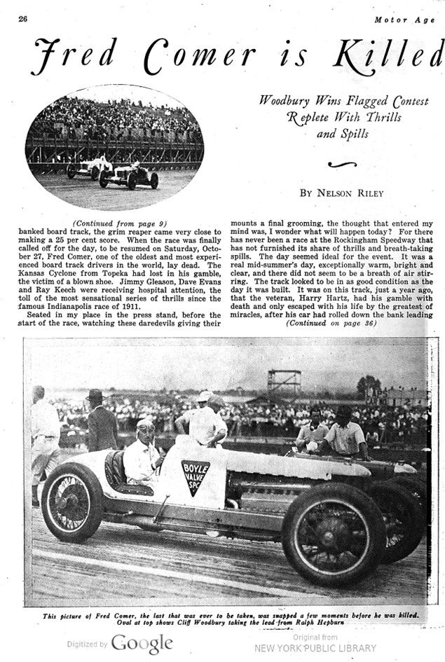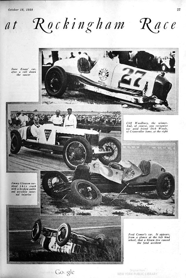 Fred Comer is Killed at Rockingham Race – Woodbury Wins Flagged Contest Replete With Thrills and Spills