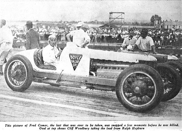 At the very start of the race it was seen that the drivers were setting a pace which would mean the lowering of the present record figures. Things began to look interesting. Competition was at its height. But a pall of gloom fell over the crowd almost at once as Fred Comer, one of the oldest of the board track drivers, rounded the bank leading into the home stretch. His car was seen to wobble as though a tire had gone. It flashed down the bank to the flat of the stretch. In the twinkling of an eye it had turned over, carrying Comer with it-twice it repeated its performance. When it finally came to a standstill, the wheels were pointing skyward and Comer was underneath with a crushed chest.