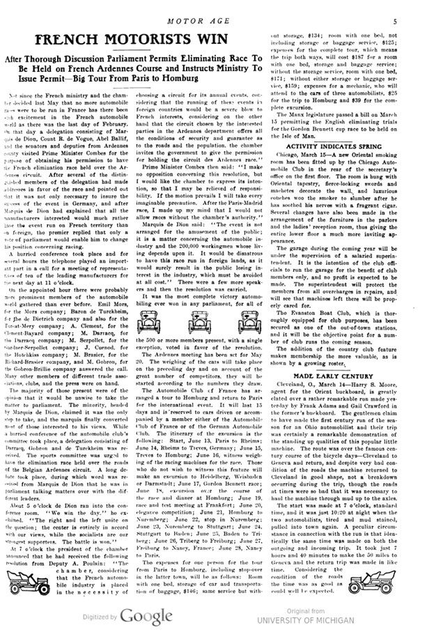 Not since the French ministry and the chamber decided last May that no more automobile races were to be run in France has there been such excitement in the French automobile world as there was the last day of February. On that day a delegation consisting of Marquis de Dion, Count R. de Vogue, Abel Ballif, and the senators and deputies from Ardennes county visited Prime Minister Combes for the purpose of obtaining his permission to have the French elimination race held over the Ardennes circuit. After several of the distinguished members of the delegation had made addresses in favor of the race and pointed out that it was not only necessary to insure the success of the event in Germany, and after Marquis de Dion had explained that all the manufacturers interested would much rather have the event run on French territory than on foreign, the premier replied that only a vote of parliament would enable him to change his position concerning racing.