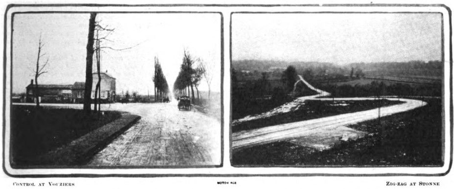 From the starting point to Vouziers, where the first control was located, is only a few miles. The road is straight and level and passes through the village of Bourcq. Quatre-Champs is the next important town. The road leading to it is fine and permits fast driving to the village of Ballay, where there is a railway crossing.