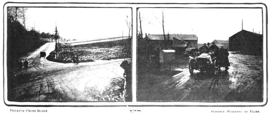The twenty-nine competitors were started in the following order: 1-Gabriel on a de Diet- rich; 2-Baras, Darracq; 3-Henriot, Clement- Bayard; 4-Baron Pierre de Crawhez, Hotch- kiss; 5 L. Thery, Georges Richard-Brazier; 6-Le Blon, Gardner-Serpollet; 7-Salleron, Mors; 8-Henry Farman, Panhard-Levassor; 9-Rigolly, Gobron-Brillie; 10-H. Rougier, road leading to it is wide and level with a Turcat-Mery; 11-Charles Jarrott, de Dietrich; few slight undulations. At Bouvellmont the 12-Beconnais, Darracq; 13-Guders, Clement- Bayard; 14-Achille Fournier, Hotchkiss; 15- Caillois, Richard-Brazier; 16-Chanliaud, Gardner-Serpollet; 17-A. Leger, Mors; 18-Teste, Panard-Levassor; 19-Duray, Gobron-Brillie; 20-De la Touloubre, Turcat-Mery; 21-Baron de Forest, de Dietrich; 22-Wagner, Darracq; 23-A. Clement, Clement-Bayard; 24-Amblard, Hotchkiss; 25-Stead, Georges Richard-Brazier; 26 Pelzer; Gardner-Serpollet; 27-Lavergne, Mors; 28-Tart, Panhard-Levassor; 29-Alexander Burton, Gobron-Brillie.