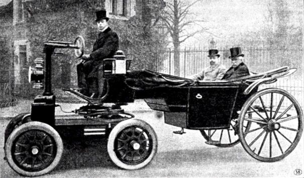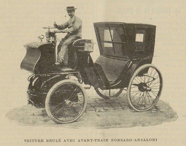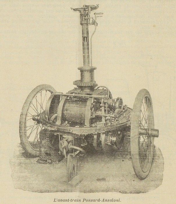 Also in 1898, another French car, the „Brûlé et “avant-train” Ponsard-Ansaloni and Roser-Mazurier engine. This vehicle was equipped with a front-wheel unit, composing of engine, 2-speed transmission and rigid axle. This unit or bogey was attached to the vehicle’s front side by a large horizontal axial bearing, around which it could rotate or swivel to ensure steering.