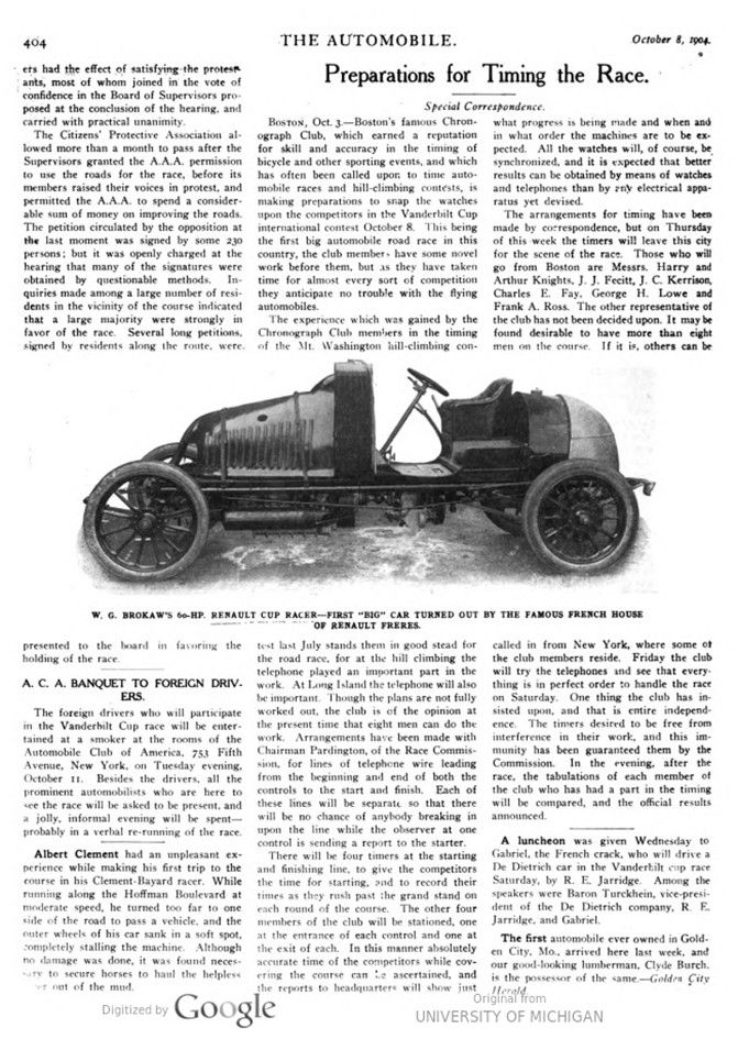 BOSTON, Oct. 3. – Boston’s famous Chronograph Club, which earned a reputation for skill and accuracy in the timing of bicycle and other sporting events, and which has often been called upon to time automobile races and hill-climbing contests, is making preparations to snap the watches upon the competitors in the Vanderbilt Cup international contest October 8. This being the first big automobile road race in this country, the club members have some novel work before them, but as they have taken time for almost every sort of competition they anticipate no trouble with the flying automobiles.