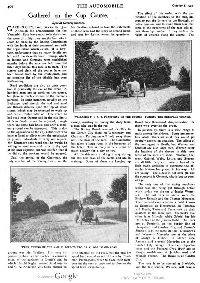 The only one of the racing machines which was not being put through active work to-day was the car of Isador Wormser. The last cars to arrive were the Brokaw Renault and the Thomas Mercedes. The Panhard cars went to a hotel known as Sammis’s, at Hempstead, on Tuesday, and Heath, Tarte and Teste took up their quarters at the same spot. Clement’s machine is at Mineola, while Gabriel has his De Dietrich at the Jericho Hotel. The Fiats are at Porrier’s, on the border line of Hempstead and Garden City, and Croker’s Simplex is at the same station. Dinsmore’s and Werner’s Mercedes are at the place of George L. Hubbell, in Garden City. Arents’s and Stevens‘ Mercedes are at the Garden City Garage. The two Pope-Toledo’s and the Packard Gray Wolf are at Krug’s road-house, at Jericho road and Mineola avenue. The Royal is at Garden City.