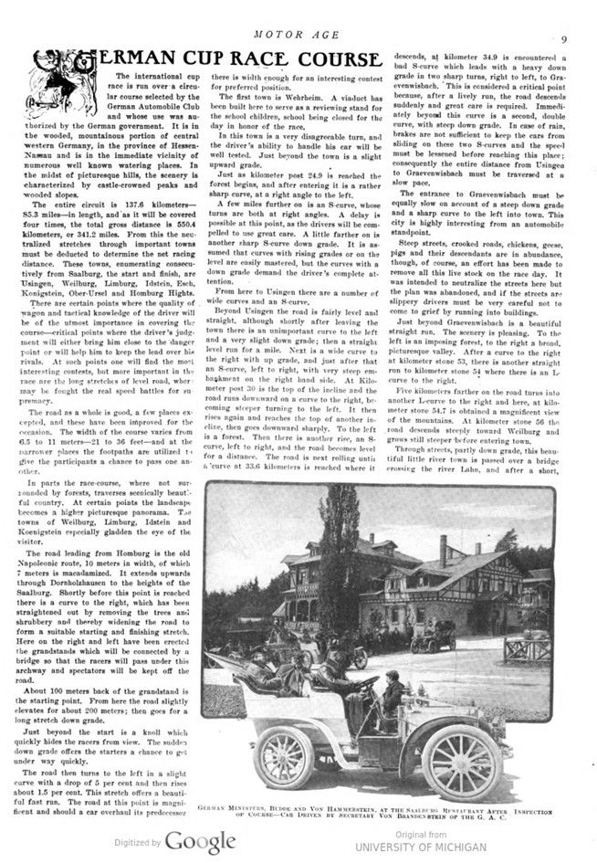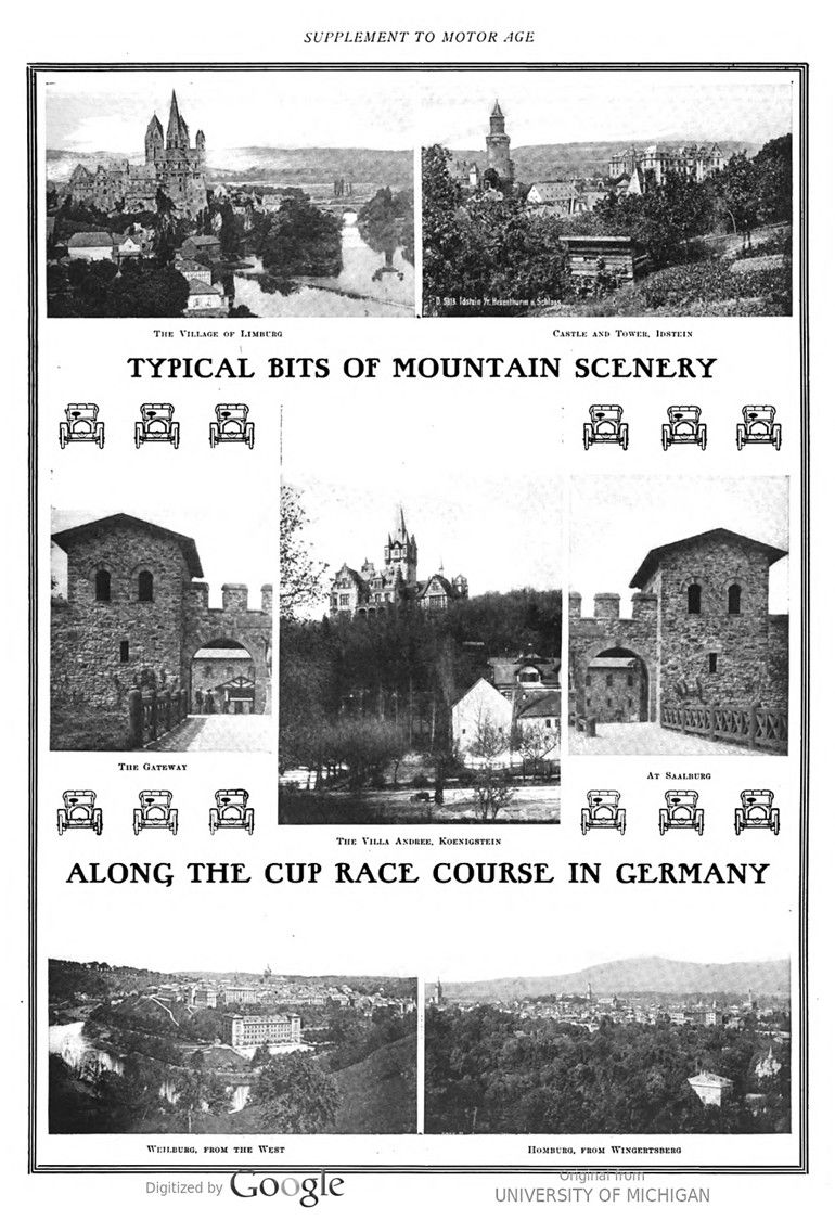 In this issue of „Motor Age“ the 1904 Gordon Bennet Cup racecourse in Germany is described. Names like Saalburg, Weilburg, Limburg, and Homburg indicate that this part of Germany has a castle-rich history. Idstein, Koenigstein, as well as Esch and Ober-Ursel are well-known names that nowadays still bring back memories of that 1904 Cup race.