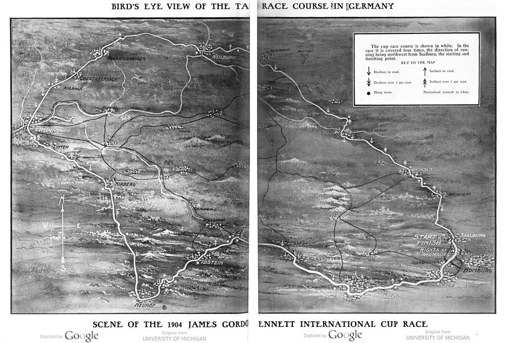 The international cup race is run over a circular course selected by the German Automobile Club and whose use was authorized by the German government. It is in the wooded, mountainous portion of central western Germany, in the province of Hessen-Nassau and is in the immediate vicinity of numerous well known watering places. In the midst of picturesque hills, the scenery is characterized by castle-crowned peaks and wooded slopes.