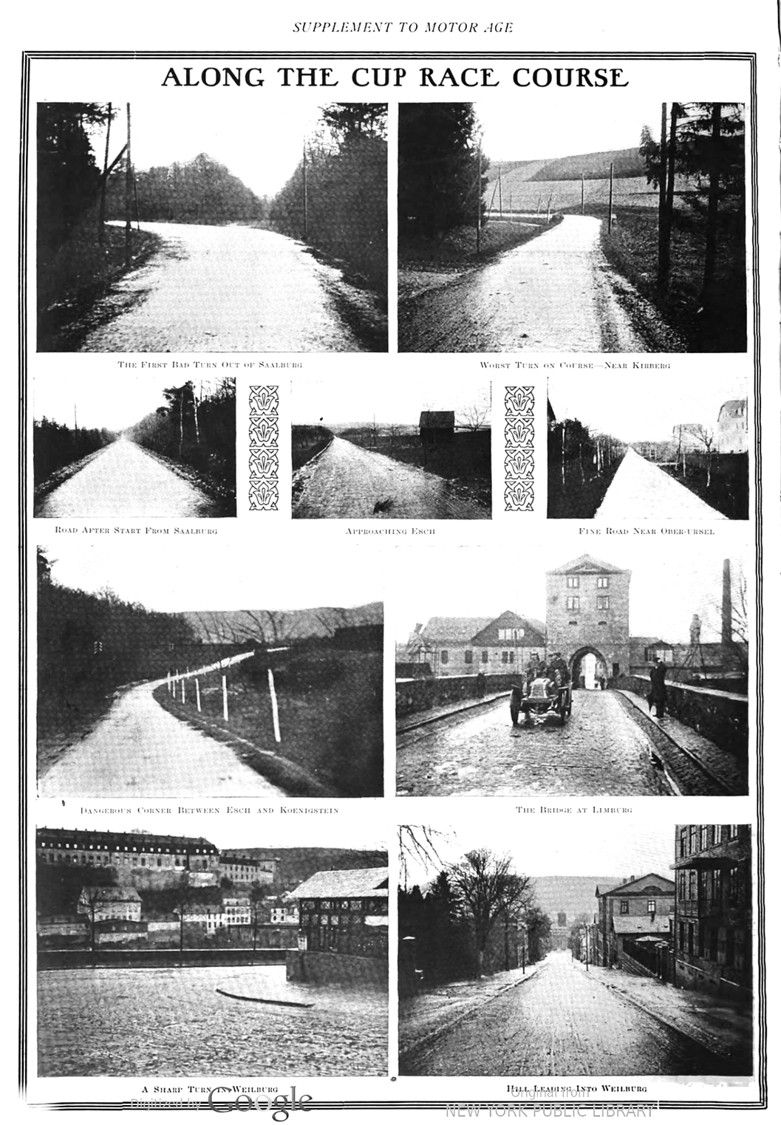 The first town is Wehrheim. A viaduct has been built here to serve as a reviewing stand for the school children, school being closed for the day in honor of the race. In this town is a very disagreeable turn, and the driver’s ability to handle his car will be well tested. Just beyond the town is a slight upward grade.