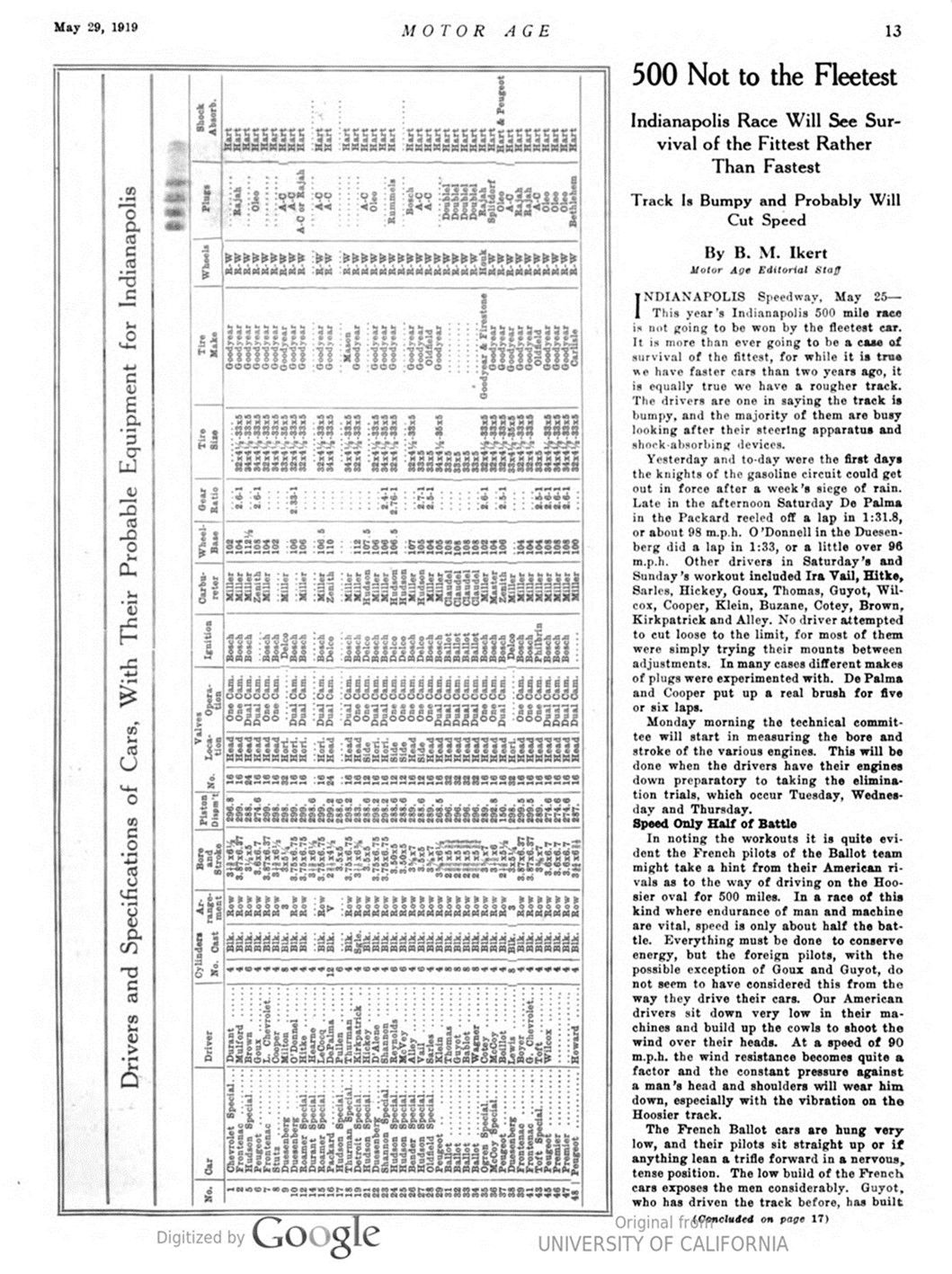 INDIANAPOLIS Speedway, May 25 – This year’s Indianapolis 500 mile race is not going to be won by the fleetest car. It is more than ever going to be a case of survival of the fittest, for while it is true we have faster cars than two years ago, it is equally true we have a rougher track. The drivers are one in saying the track is bumpy, and the majority of them are busy looking after their steering apparatus and shock-absorbing devices.