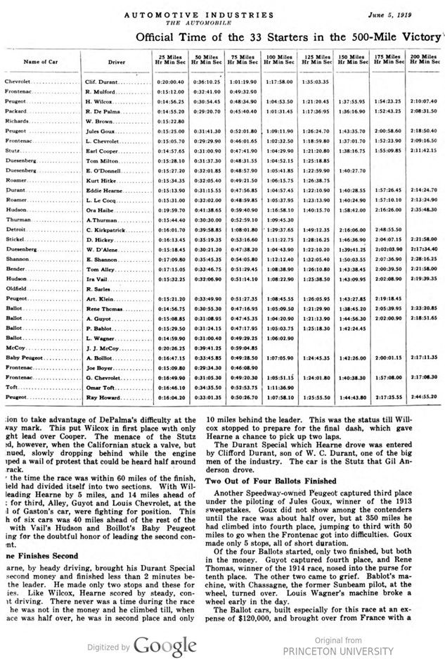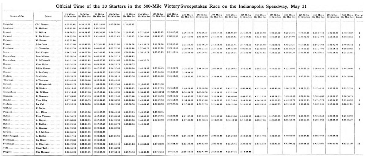 The Ballot cars, built especially for this race at an expense of $120,000, and brought over from France with a crew of Europe’s best drivers, did not come up to expectations. That they had speed was shown in practice and in the elimination trials. They did not stand the 500 miles on the bricks. Guyot only made three stops, and these not of long duration. Thomas made five stops for supplies and tires. He seemed to be taking things very easy.