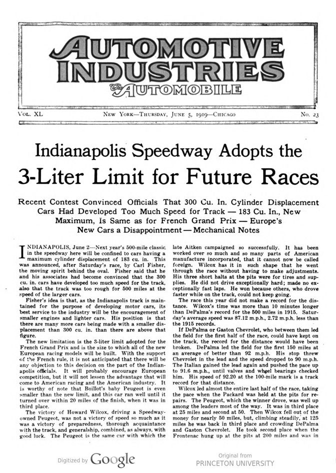 Indianapolis Speedway Adopts the 3-Liter Limit for Future Races – Automotive Industries – 5 June 1919