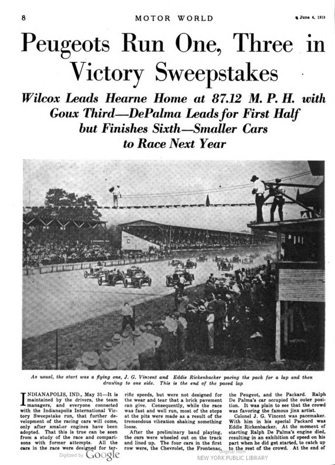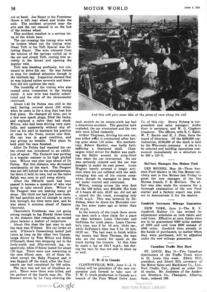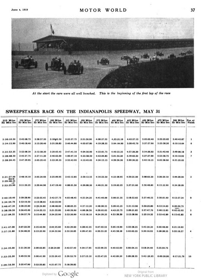 The magazine Motor World, having started at around 1900, gave this condensed, but none the less complete view of the most important race events in the 1919 Liberty Sweepstakes, even writing on the lethal accidents.