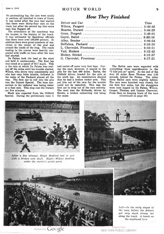 The Ballot cars were regarded with everything from apprehension to the „I told you so“ spirit. At the end of the first 25 miles Rene Thomas was 1.55 seconds behind De Palma. The other three Ballot cars were slightly behind. The cars were bunched very closely for the first few miles, but the stragglers were soon lapped by De Palma, Wilcox, Cooper, Thomas, and Gaston Chevrolet. From then on keeping track of the race in chronological order became almost impossible.