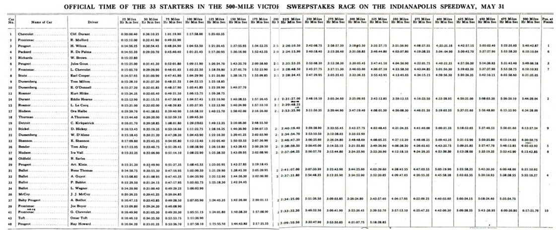 OFFICIAL TIME OF THE 33 STARTERS IN THE 500-MILE VICTOR SWEEPSTAKES RACE ON THE INDIANAPOLIS SPEEDWAY, MAY 31