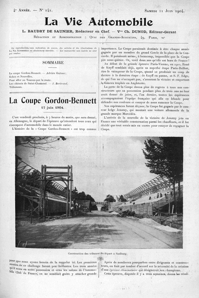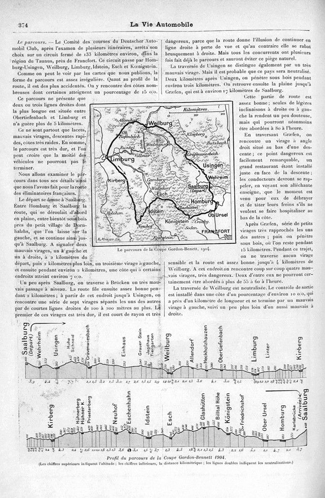 This article of the French La Vie automobile basically describes the complete route of the 1904 Gordon Bennett Race. After a short introduction on the past races, the 18 contestants and their cars are presented, with several pictures of them. Then, the entire route through the German Taunus mountains is described very accurately, inclusive a route map with ascents and descents.