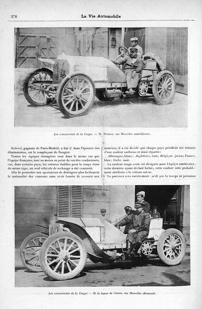 378 : Les concurrents de la Coupe. — M, Werner, sur Mercédès autrichienne. — M. le baron de Caters, sur Mercédès allemande
