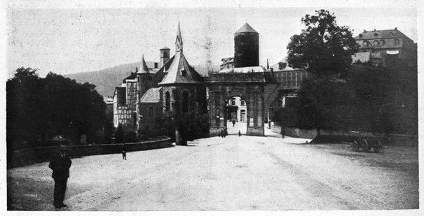 370 : Dans une descente, après les tribunes de Saalburg, on a construit un pont au-dessus de la route pour le passage des piétons. — Descente à l’entrée de Weilburg (10 %). — L’horizontalité des murs indique la grandeur de la pente.