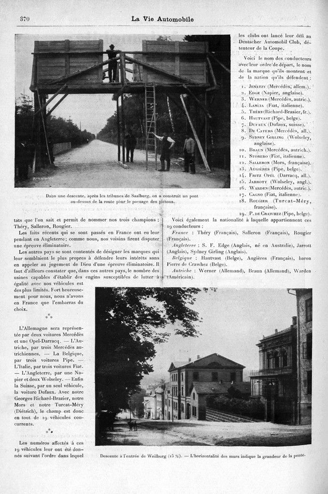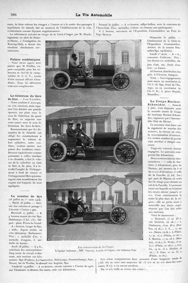 379 – 380 : Les concurrents de la Coupe. — M. Hiéronymus, sur Mercédès autrichienne. — L’équipe italienne. MM Storero, Lancia et Cagno, sur voitures Fiat.