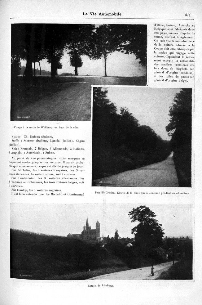 II est bien entendu que les Michelin et Continental d’Italie, Suisse, Autriche et Belgique sont fabriqués dans ces pays mêmes d’après licence, suivant le règlement. On sait que la moindre pièce de la voiture admise à la Coupe doit être fabriquée par la nation qui engage cette voiture. Cependant le règlement excepte la nationalité des matières premières des fers doux de magnéto (en général d’origine suédoise), et des toiles de pneus (en général d’origine belge).