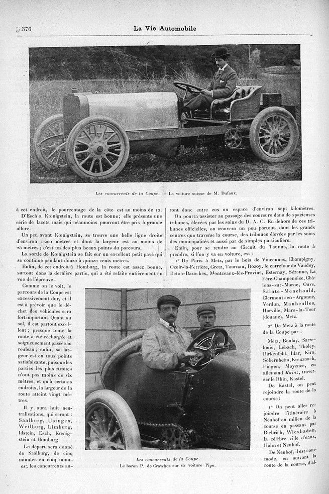 376 : Les concurrents de la Coupe. — La voiture suisse de M. Dufaux. — Le baron P. de Crawhez sur sa voiture Pipe.