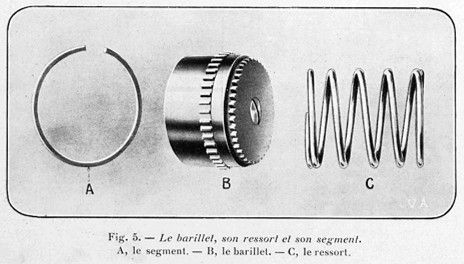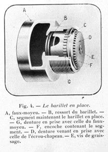 Pour maintenir le barillet en place et empêcher que le ressort le projette au dehors, une gorge F (fig. 4) pratiquée dans le faux moyeu, reçoit un segmente qui s’appuie sur la denture du barillet.